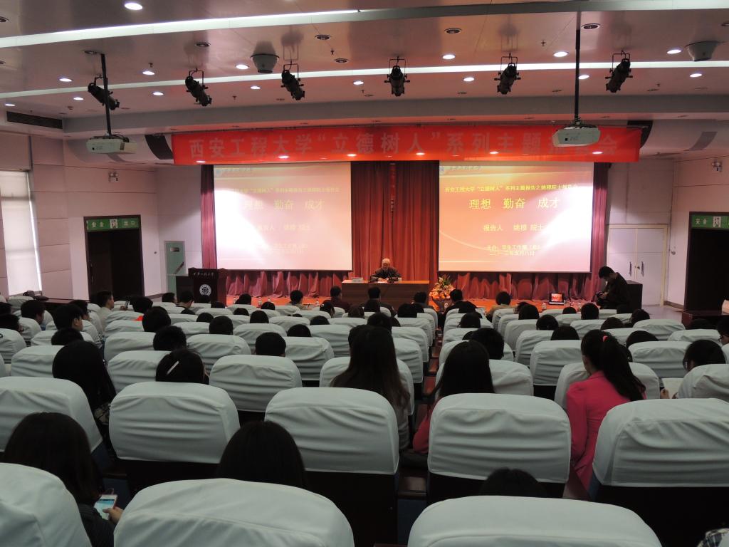 5月8日下午,中国工程院院士、我校名誉校长、博士研究生导师姚穆教授在临潼校区图书馆二楼报告厅给在校大学生做了题为“理想•勤奋•成才”的报告。本次报告是我校“立德树人”系列主题报告之一。校党委副书记李博飞、陕西省“三秦学者”孙润军、相关部门负责人,各学院学生工作主管、辅导员、学生代表等300余人参加了报告会。报告会由李博飞主持。