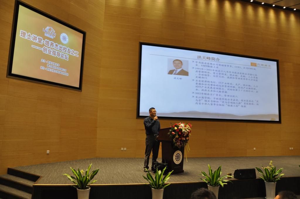 洪天峰拥有十八年华为公司核心高层的管理经历,具有深厚的电信IT产品研发、生产,供应链运作、人力资源和公司整体运营等管理经验,在他的以“在商业环境的变革中坚定前行”为主题的报告中,洪天峰凭借自己多年的职场经历和经验,提出了创业成功的三条必要条件,即:坚定的意志力、较强的学习能力和永远乐观的心态。他根据自身和周围的实例强调了把握机会的重要性以及创业对于大学生成长成才的巨大影响力。最后的互动环节,洪天峰用严谨而又不乏风趣的话语一一解答了现场大学生提出的困惑,赢得了同学们的连连掌声。