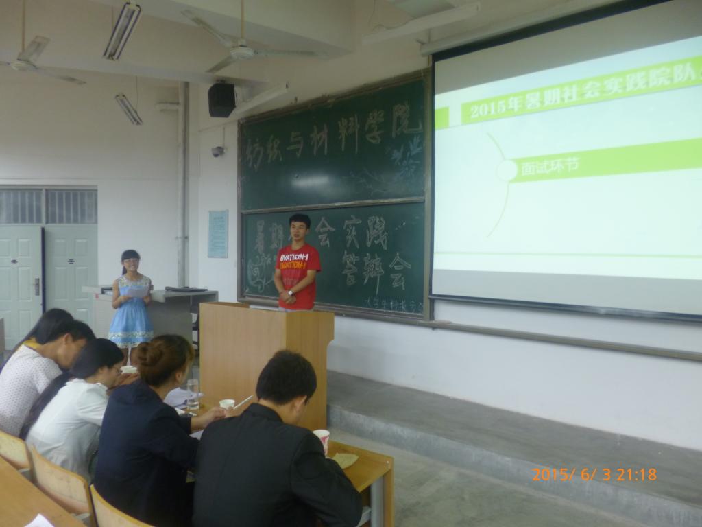 2015年6月3日晚7点,纺织与材料学院在临潼校区B137教室召开2015年暑期社会实践活动答辩会,参加本次会议的有纺织与材料学院2014级辅导员高黎老师和2013级辅导员付成程老师以及学生会主席团、各答辩立项团队和积极报名的100余名学生。