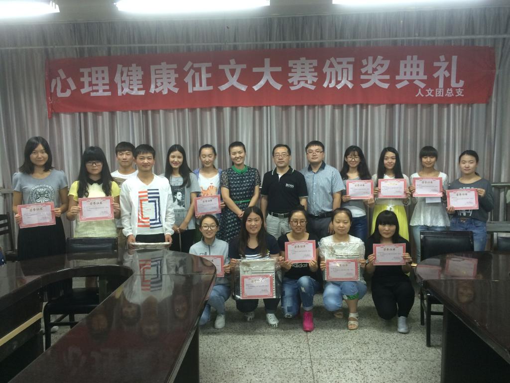 为加强大学生自我心理认知,促进身心健康的发展,根据《关于开展我校2015年大学生心理健康教育宣传月的安排意见》要求,人文学院积极组织开展心理健康月活动,结合学院专业特点特此举办本次心理健康月主题征文活动。本次活动从前期的宣传、征稿到评审历时近一个月的时间后圆满结束,参与学生覆盖学院各个专业,征得稿件近百件。经过人文学院文学艺术系专业教师及心理健康兼职教师的认真评选,最终评选出一等奖1名,二等奖3名,三等奖5名及优秀奖若干。
