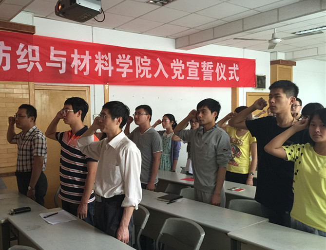 2015年6月30日,纺织与材料学院新党员入党宣誓大会在金花校区姚穆报告厅举行。纺织与材料学院党委书记阚佩、学生工作部主任杨建军和辅导员赵勇进参加了宣誓仪式。宣誓仪式由纺织与材料学院党委副书记郭西平主持。