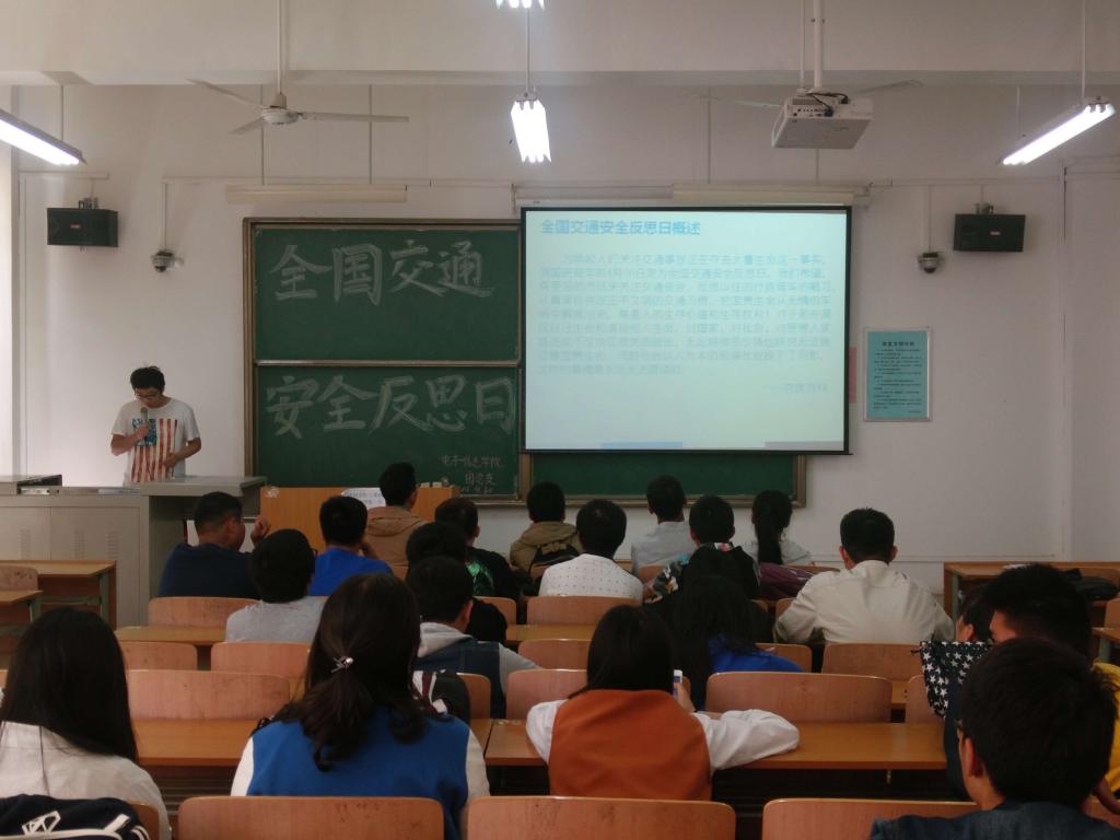 为了加强大学生对交通安全问题的重视,电子信息学院团总支开展了全国交通反思日团日活动,以此来增强同学们对自我安全的保护意识 。