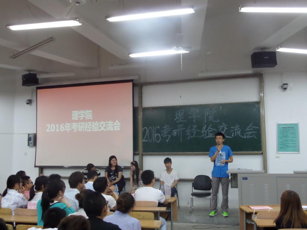 2016年5月24日晚,理学院在B-133教室举行了2016年“明理大讲堂”之考研优秀学生经验交流会。2015级辅导员杨光、13级全体同学、14级全体宿舍舍长、15级团学科全体干事以及各年级有考研意向的同学参加了此次活动。