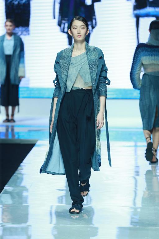 棉布填千层,麻线扎千针。本系列服装来源于传统手工艺——千层底,传统的手工艺布鞋曾经在那个年代辉煌一时,现在看起来又充满乡土气息的草根手艺,伴随我们的生活一路走来,见证了时代的变迁之后,正在逐步地淡出我们的视线,那些渐行渐远的往日岁月,只留下这一张张的照片,成为记忆当中最深处的怀念……而如今却在被人们一点点淡忘。我从小就穿着奶奶亲手纳的鞋底,做一双鞋的工艺很复杂,一针一线都是时间。密密麻麻的针脚充满了爱。将一行行整齐的线迹作为元素,运用到水洗棉上,体现布鞋的质感,再加上针织的肌理,意在表达时间在针线间静静流淌……