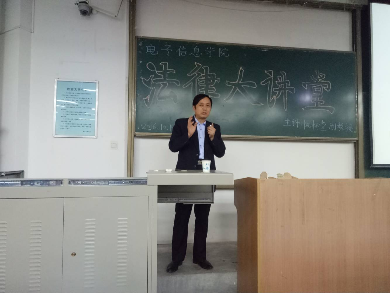 10月19日,电子信息学院在教学楼B-137举行了新生引导月之法律大讲堂——做个守法的大学生。我校马克思主义学院阮怀堂副教授主讲,院党委副书记杨建军、辅导员刘风萍及16级全体学生参加了讲座。