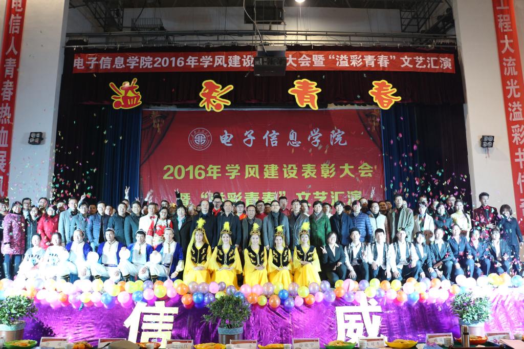 11月25日晚,电信学院2016年学风建设表彰大会暨 “溢彩青春”文艺汇演在临潼校区大学生活动中心举办。我校名誉校长姚穆院士、校党委副书记李博飞、副校长李鹏飞、副校长兼电信学院院长黄新波视频送上祝福和寄语。校离退休办党委书记张平、学生工作部(处)副处长臧国强、学院党政领导班子全体成员,各系部老师、全体辅导员及2016级新生430余人参加了文艺汇演。