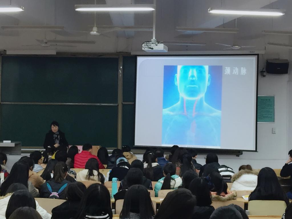 讲座分为两部分。上半场,刘院长通过图片展示,深入浅出的向同学们讲解了人体的基本构造,并通过理论联系实际案例、讲解配合现场演示的形式,围绕创伤、气管异物、心肺复苏等关键词,图文并茂、生动形象的向学生们讲授了相关急救知识,着重介绍了现场救护的步骤和急救的主要技术和突遇紧急情况因如何呼救。随后刘院长为同学们总结出“争分夺秒,就地抢救,沉着果断,坚持不懈,先救后送,急救与呼救并重”的急救原则,言简意赅,让同学们都能在短时间内领悟掌握。