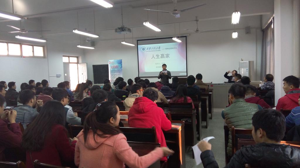 首先杨建军老师对此次讲座进行简要的流程介绍,接着王健展开 “人生赢家”主题报告。报告内容强调积极与人沟通,培养表达能力;年轻时自我学习,提升自己,然后再就去找另一半,但是遇到就珍惜;经历是人生最好的学习,我们应该多去经历,多去实践;性格决定命运,人生总是命中注定,在社会中不要求得所有人的认同,要有长远的目光。
