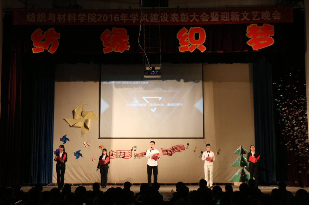 2016年12月16日19时,纺织与材料学院2016学风建设表彰大会暨“纺缘织梦”迎新文艺晚会在西安工程大学临潼校区大学生活动中心圆满举行。莅临本次大会的嘉宾有纺织与材料学院党委书记阚佩、党委副书记郭西平、副院长刘呈坤、轻化工程系教授王雪燕、纺织工程系申国栋、高分子材料与工程系王斌、非织造材料与工程系窦皓、学生工作部(处)教育管理科副科长冯翊、学生工作部(处)办公室杨光、学生工作办公室主任赵勇进、各兄弟学院辅导员老师以及16级全体新生参加了表彰大会。