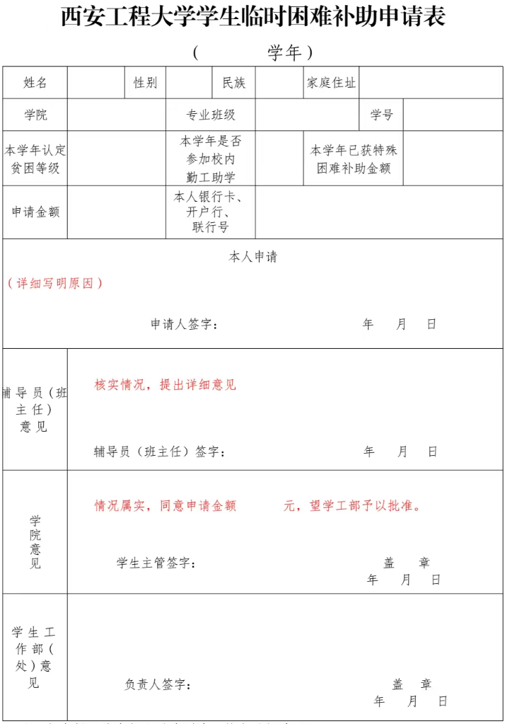 (一)学生申请。家庭经济困难的学生本人填写《西安工程大学学生临时困难补助申请表》,向所在学院提出申请;