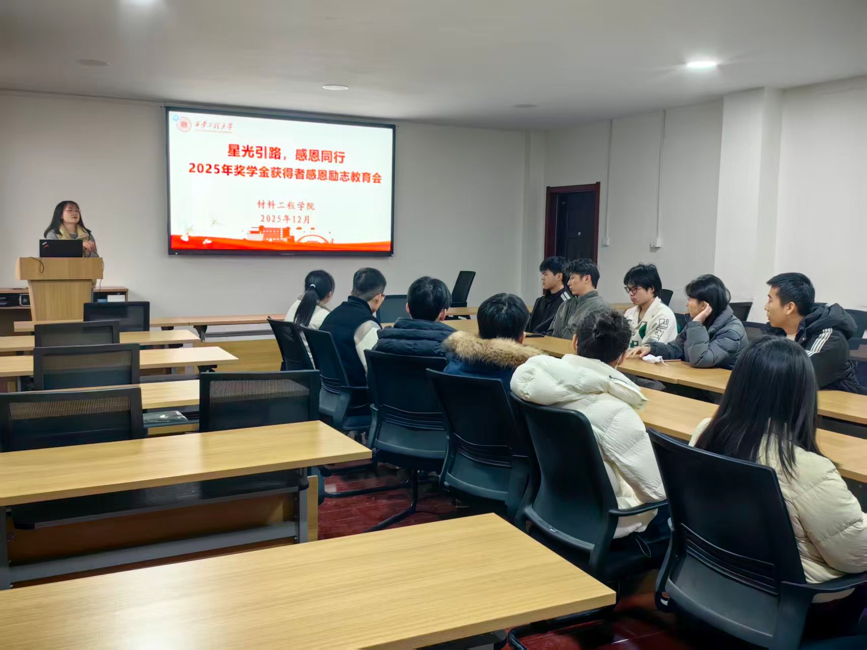 为充分发挥国家奖学金、国家励志奖学金等获奖学生的榜样引领作用,深化感恩励志教育,营造勤奋好学、积极向上的学风氛围,引导学生树立正确的成才观与价值观,材料工程学院于12月22日在材料楼2015会议室举办“星光引路,感恩同行”感恩励志教育交流会。活动由学院资助辅导员杨早宁主持,全体2025年国家奖学金、国家励志奖学金获得者及资助助理参加了本次活动。